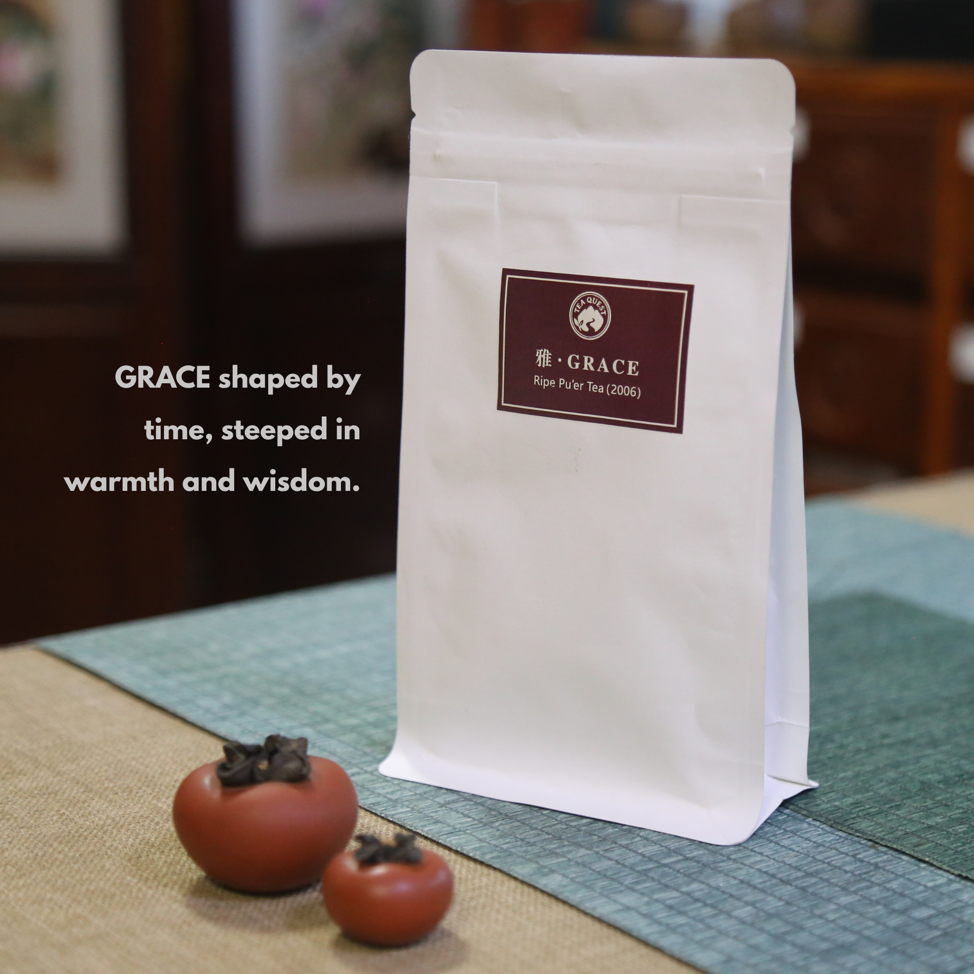 From Yunnan’s ancient tea mountains, Grace is a carefully aged ripe Pu-erh, mellowed through nearly two decades of quiet transformation. Its deep amber liquor flows smooth and sweet with notes of warm wood and earth after rain.